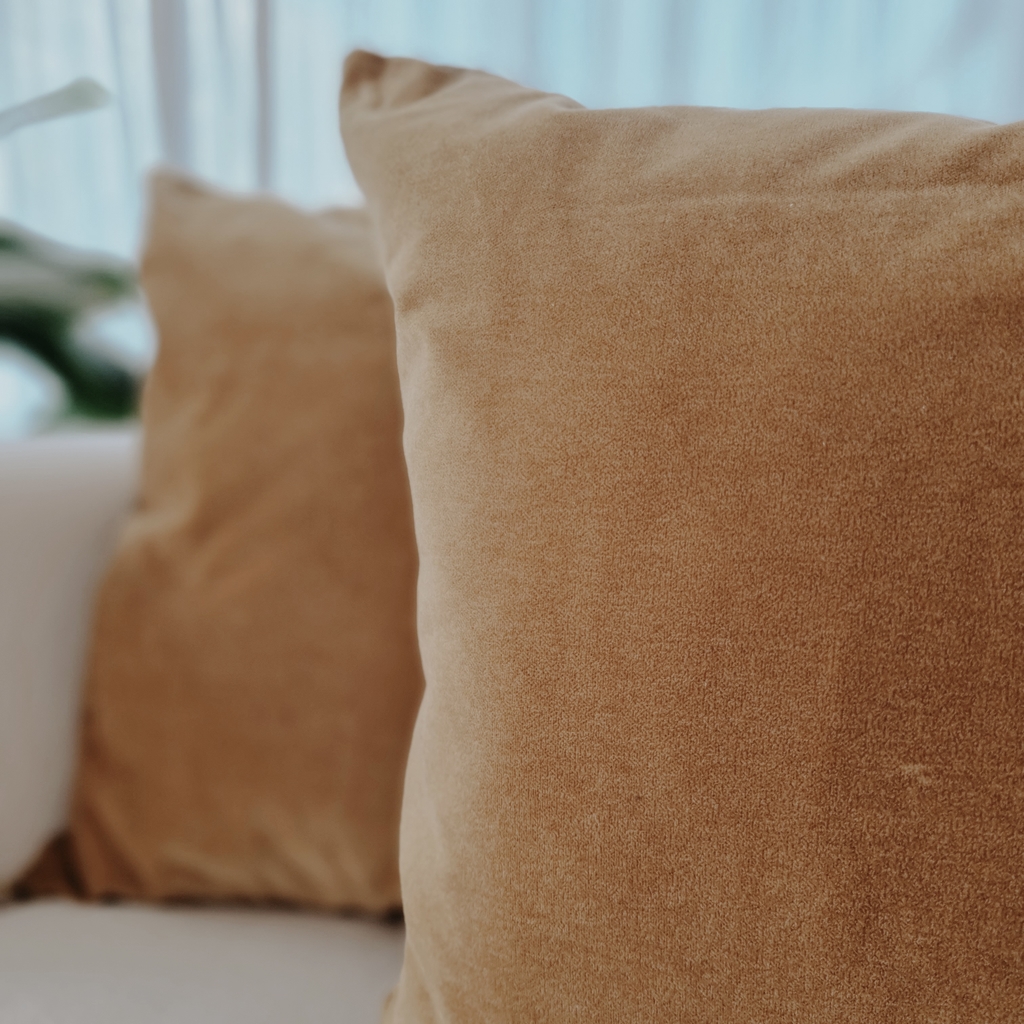 Almohadon realizado en pana y tusor. Relleno con vellón siliconado. Color Tostado. Medidas 50x50.